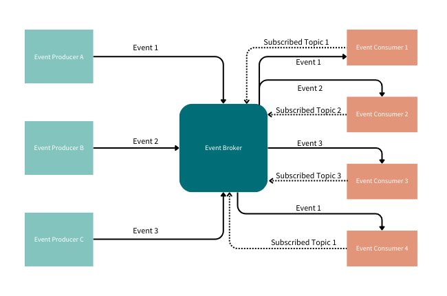 Wenn ein Event Consumer sich für ein bestimmtes Topic anmeldet, abonniert er dieses Thema. Das bedeutet, dass er nur Ereignisse empfängt, die diesem Topic zugeordnet sind. Durch das Abonnieren von Topics kann ein Event Consumer gezielt auf Ereignisse reagieren, die für ihn relevant sind, und andere Ereignisse ignorieren.