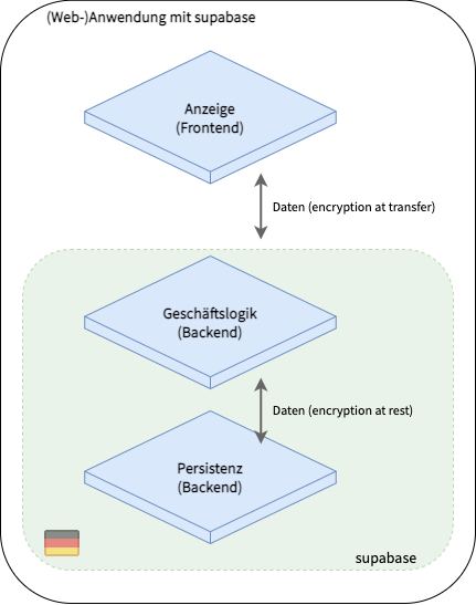 Die oben genannte Open-Source-Software kann eingesetzt werden, um ein Backend zu betreiben. supabase ist so konzipiert, dass es in der Cloud betrieben werden kann. Man kann mit supabase also ein Backend selbst betreiben und dabei Cloud Provider wie AWS oder die Google Cloud Plattform benutzen. Bei beiden Providern kann man strikt auf den Betrieb der Server in Deutschland achten. So kann supabase gleichzeitig in der Cloud und auf deutschen Servern betreiben werden. supabase speichert die Daten in einer PostgreSQL-Datenbank. Da diese selbst konfiguriert werden kann, ist hier sichergestellt, dass die Daten in Deutschland gespeichert werden. Datenbanken, die bei einem Cloud-Provider betrieben werden, können, ebenso wie Server, strikt auf einen bestimmten Standort beschränkt werden. Damit eignet sich supabase als ein Cloud-basiertes Backend, welches vollständig in Deutschland betrieben werden kann. Die Abbildung unten zeigt, wie supabase innerhalb der drei Schichten einzuordnen ist.