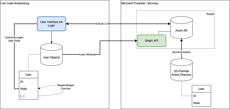 Die meisten Low Code Anwendungen werden als Webanwendungen gehostet - sie “leben in der Cloud”. Daher benötigt die Integration einer Low Code-Anwendung mit dem Active Directory drei grundlegende Bausteine. Dies sind die Synchronisation des Active Directories in das Azure AD, die Microsoft Graph API und OAuth 2.0.